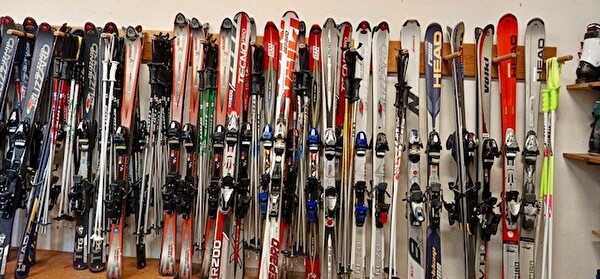 Daher stehen viele Skier, Skischuhe und Stöcke für Erwachsene